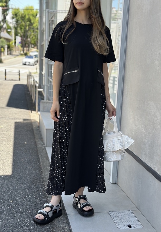 サイドポケット異素材切替半袖ワンピース