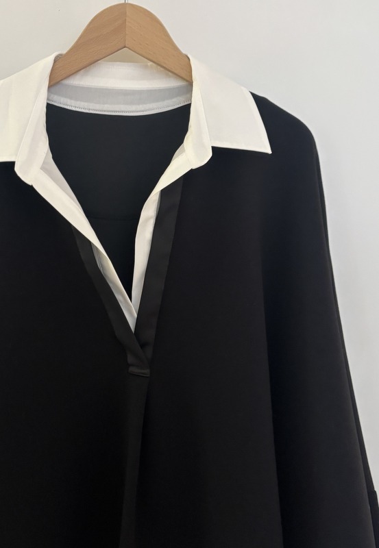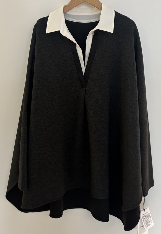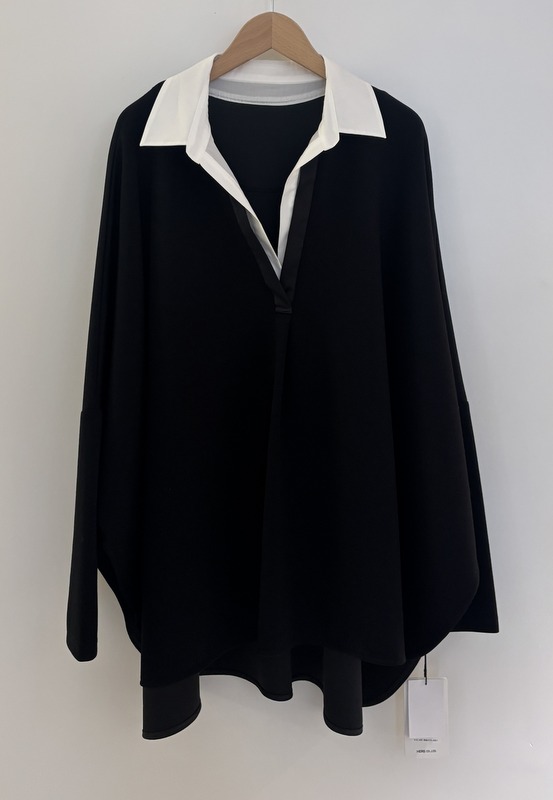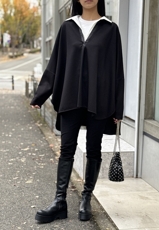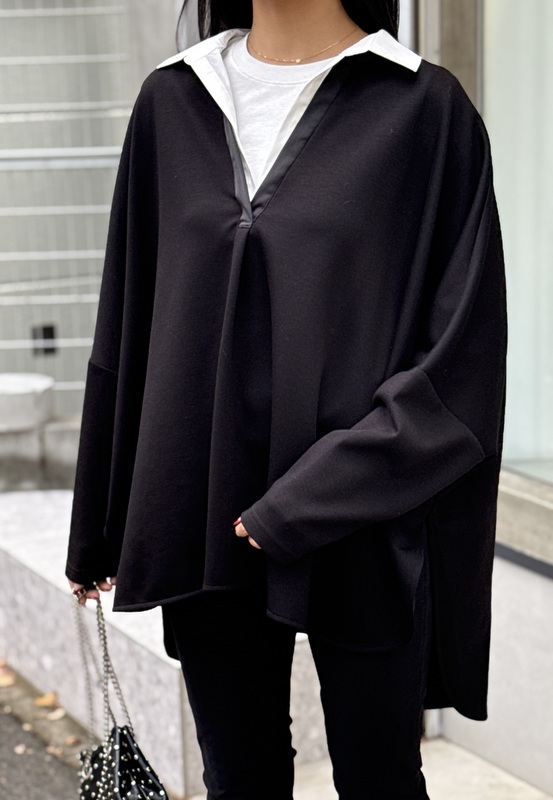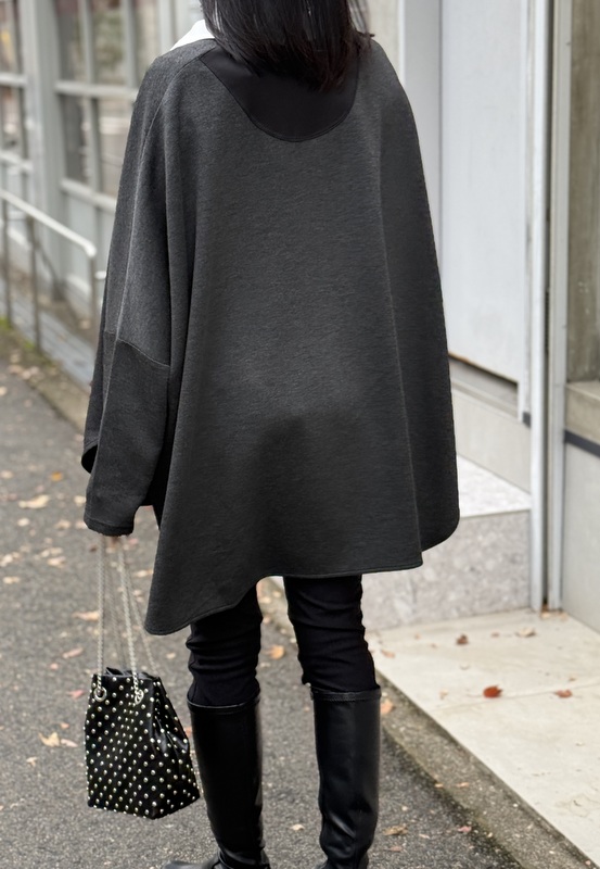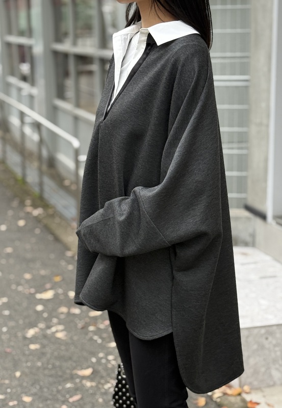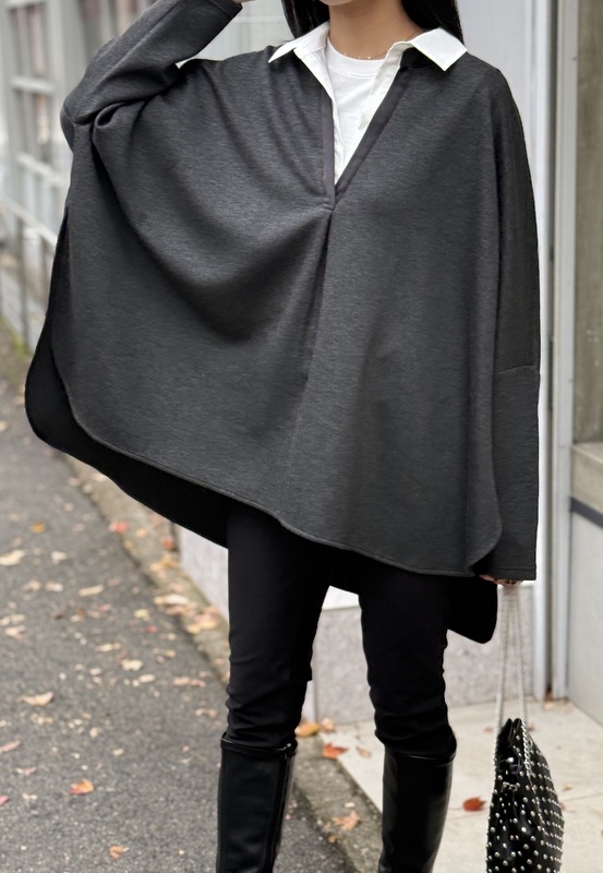 COLOR:グレー・ブラック SIZE:F MATERIAL:ポリエステル49%・レーヨン45%・ポリウレタン6% 衿部分)綿55%・ナイロン42%・ポリウレタン3% 切り替え部分)ポリエステル100%